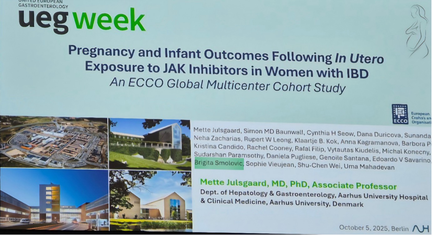 Tokom kongresa Prof dr Brigita Smolović je prisustvovala oralnoj prezentaciji naučnog rada na kome je koautor, pod nazivom "PREGNANCY AND INFANT OUTCOMES FOLLOWING IN UTERO EXPOSURE TO JAK INHIBITORS IN WOMEN WITH INFLAMMATORY BOWEL DISEASE: A GLOBAL MULTICENTER COHORT STUDY" autora Prof dr Mette Julsgaard.